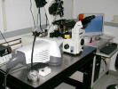 This confocal system has a Yokogawa multiple lens Nipkow spinning disk scanner (CSU10), allowing it to capture confocal images rapidly with a minimum of excitation light. Images are captured using a Hamamatsu OrcaER camera driven by the SimpelPCI software from Hamamatsu. Excitation light is provided by a ~100 mW Krypton/Argon laser, which can excite at 488, 568 & 647 nm. Imaging of FITC-like, Rhodamine-like, Cy5-like and similar fluorophores, including GFP, Calcium Green & Texas Red can be carried out. A filter wheel changes emission filters. A Prior motorized drive is attached to the fine focus knob for software control of z- position. Transmitted light shutter permits widefield, DIC or phase contrast images to be interlaced with fluorescent image capture. Acquisition modes can be combinations of z-series, time lapse, &/or multiple fluorophores.