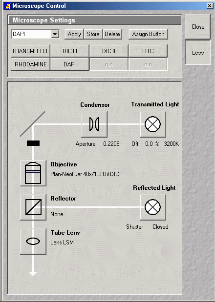 Then select TRANSMITTED or DIC III or DIC II or FITC or TRITC. Note: be careful to let the cube carousel to finish rotating in order to avoid getting a blast of HBO lamp light through the oculars. (Zeiss have been notified of this problem.)