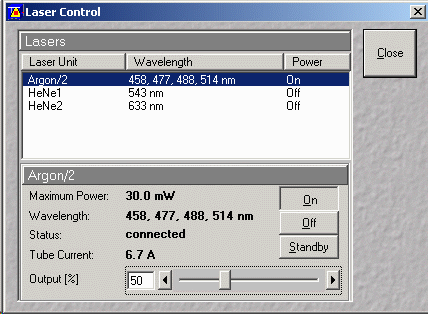 Use of the Argon/2 laser: The Zeiss LSM software now forces starting the Argon/2 laser in standby mode. Once the laser has warned up Status switches to connected and the On can be pressed to run the laser.